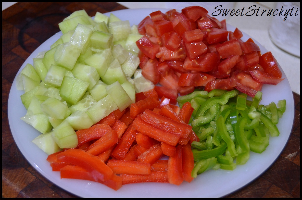 - Cortamos los tomates, el pepino y los pimientos en dados y trozos.