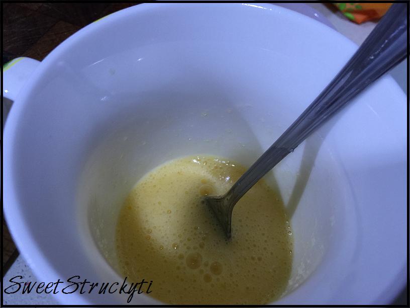 - Vertemos en la taza que vayamos a usar la mantequilla, el azúcar y el huevo. Mezclamos muy bien con un tenedor (o con lo que podáis) hasta que esté todo bien mezclado.